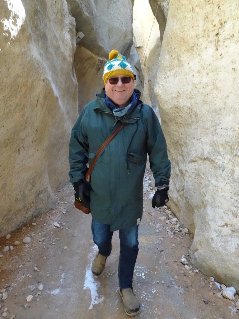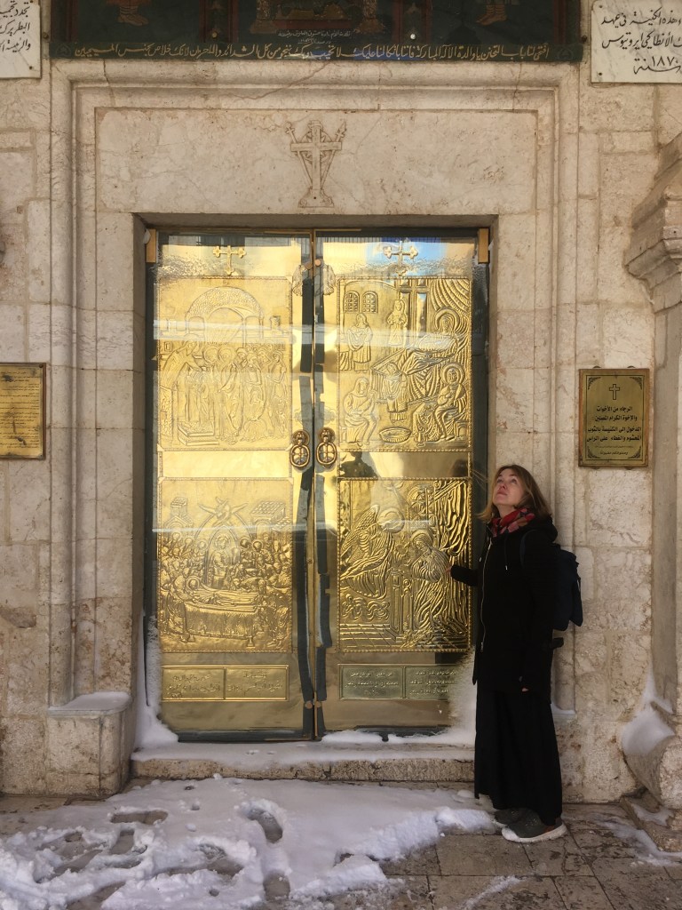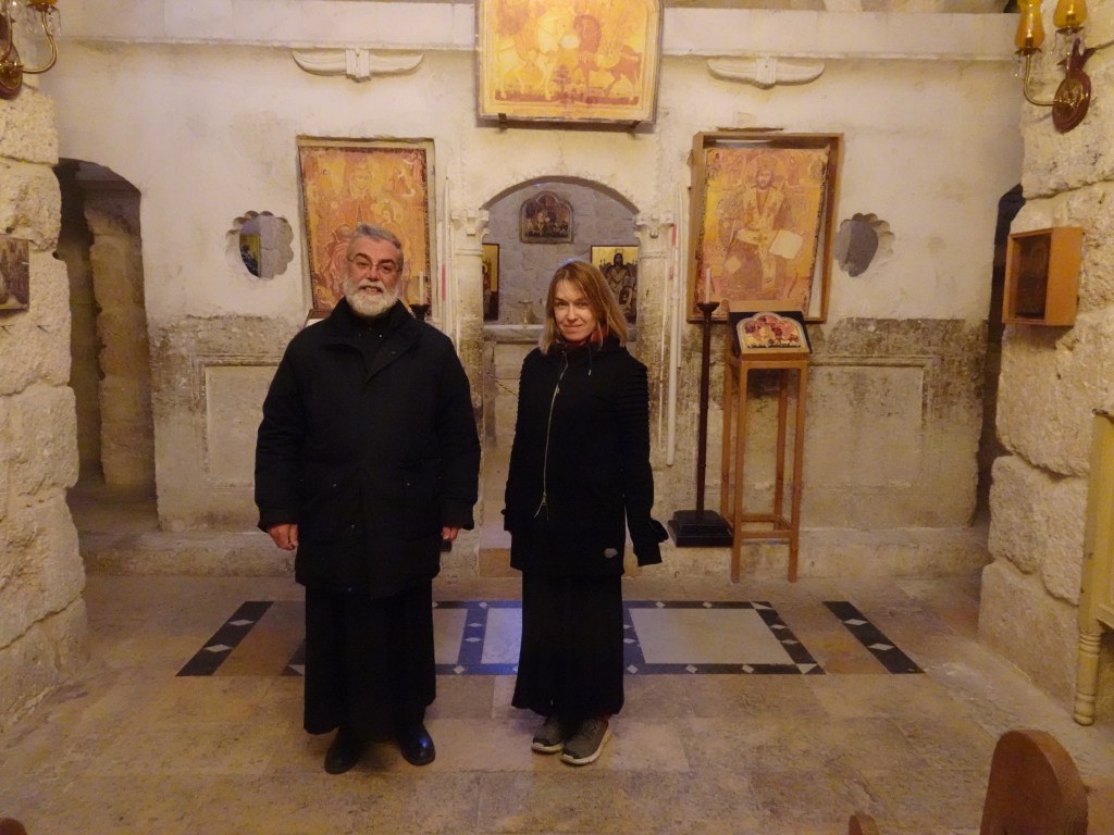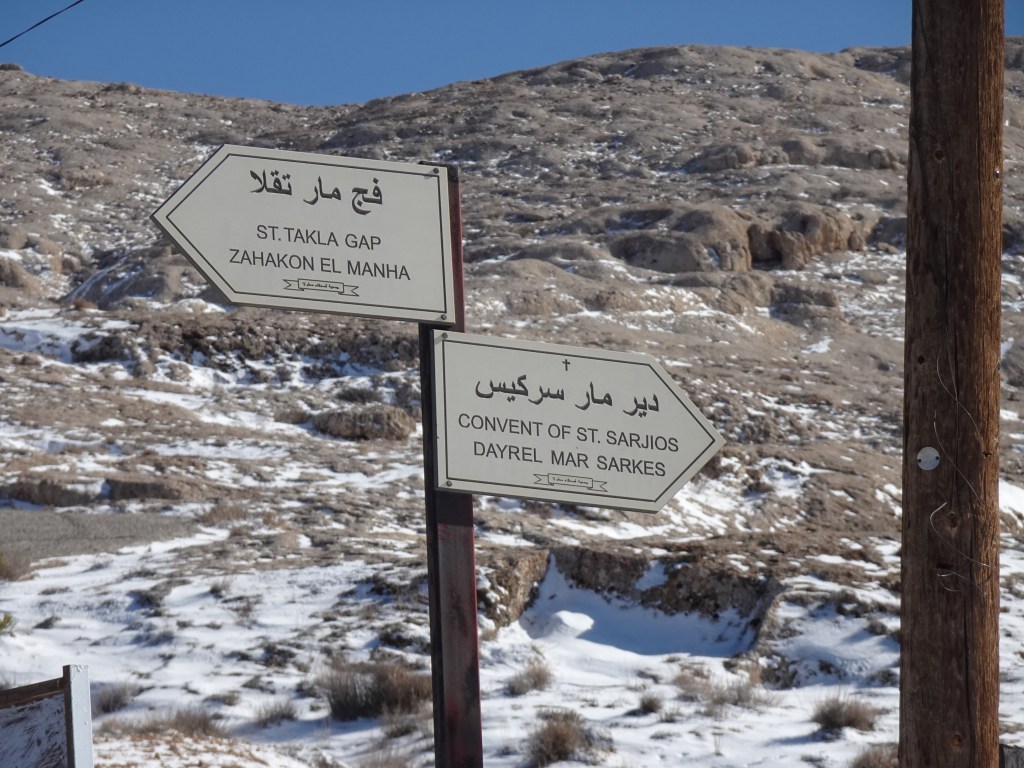 Meie soovime külastada mäe otsas asuvat Sergiuse kloostrit. Maaloula piirkond on ainuke, kus räägitakse aramea keelt- keelt, milles rääkis Jeesus. Emakeelena siinsetel lastel esimene, araabia keel lisandub alles koolis. Bilal ütleb, et kui meil veab, võime ka aramea keeles palvet kuulda. (Vedas. Isa Toufik oli juhuslikul kohal luges meieisa palve). Mööda kitsast lumist kanjonit jõudsime lõpuks mäe otsa, kus maha jäetud 5*hotelli (oli terroristide peakontoriks) kõrval on väga hästi restaureeritud Süüria enda märtrite Sergiuse ja Baccuse klooster (615-625). Hävitatud ikoonide asemel on originaalsuuruses fotod hävitatud ikoonidest. Kaks originaalikooni jäid jäid imekombel alles. Osa on ka viimasel ajal annetusena kingitud. Isa Toufik tuli meid uksele tervitama. Minu imestuse peale kiirest restaureerimisest ütles naerdes, et kõik Sergeid üle maailma annetasid ja nii saadigi restaureerimise jaoks rahad kokku. Bilali nähes läks eriti rõõmsaks. Kallistused-tervitused. Polnud üksteist sõjast saati näinud. Bilal hiljem kommenteeris, et kristlike kirikutega on hästi. Toetused tulevad välismaalt. Taastatakse. Aga moslemite pühakohad…. nende riikidega, kus toetus võiks tulla, pole hetkel head läbisaamist.