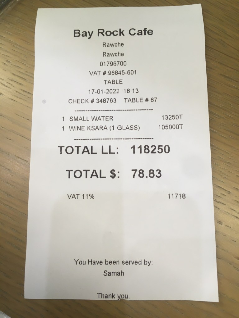 Käisin vaatamas Beiruti ühte sümbolitest Raouche kaljumoodustisi Vahemeres. “The must” on seal kaljuserval kohvikus ka istet võtta ja midagi tellida. Klaasi veini ja pudeli vee eest tuli selline arve