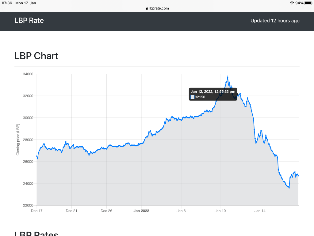 17.01.22 Tundub, et nädalavahetusega on dollar oma väärtust tunduvalt muutnud. Ametlik kurss on umbes 1500 LBP ühe dollari eest, alternatiivsel ehk mustal turul on ühe dollari eest saadav summa mõne päevaga