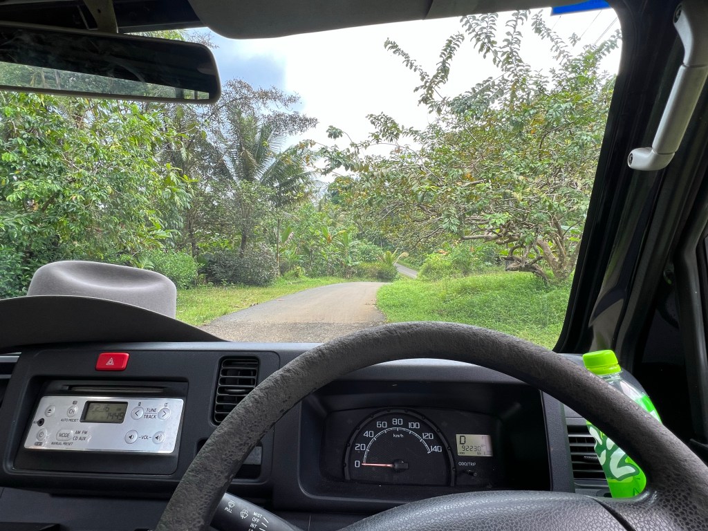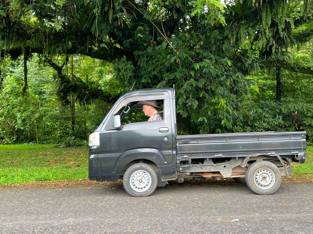 Ka siin nagu Majuroski on takso väga mõistliku hinnaga ja inimese pealt, aga kuna soovisime kogu saarele tiiru peale teha, siis soovisime rentida autot. Enne saabumist ei õnnestunud, autorendifirmadel pole koduleht vajalik, seega küsisime hotellist saabumise õhtul. Uurivad. Ka järgmisel hommikul uurisid. „Ei saa“ on raske öelda. Ütlesid, ühelgi neljast autofirmast pole, õigemini pole sõiduautot. Ütlesin, et sobib ka kõik muu, kui saarele tiiru peale teha saab. Olgu, proovime, aga kas ma manualiga sõta oskad? See on see mille saime.