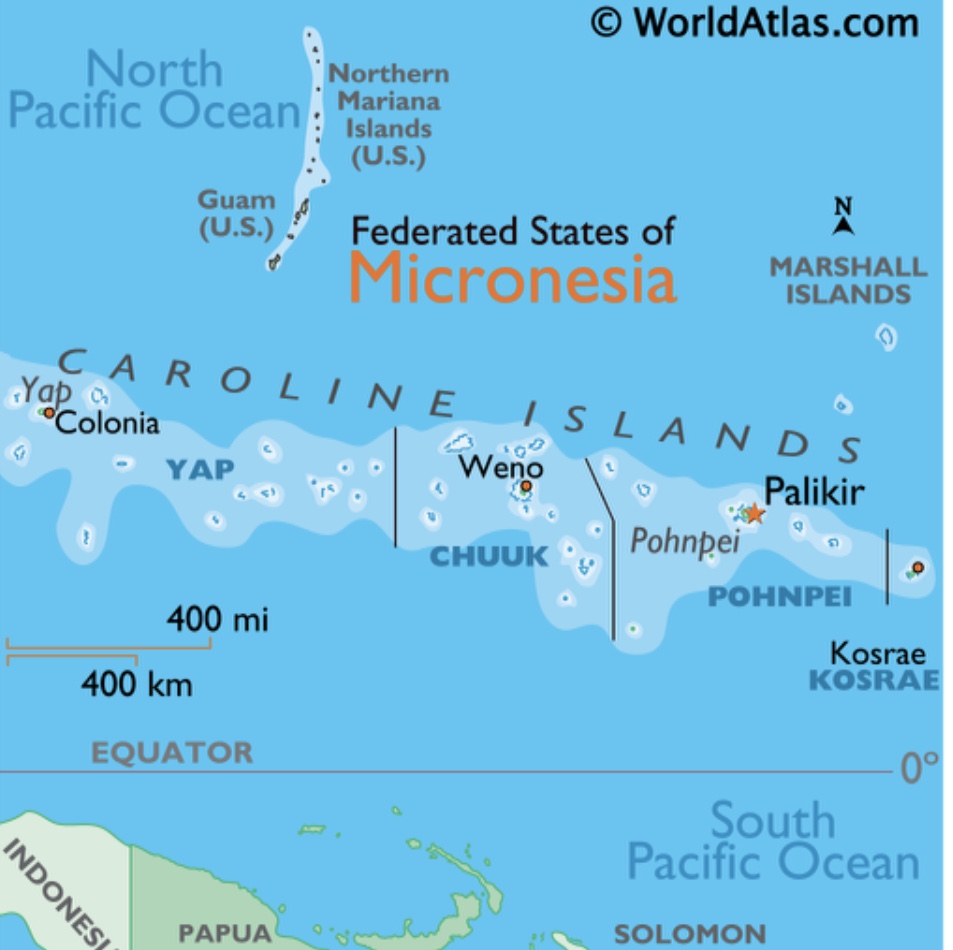 Majurost toimuvatest Mikroneesia mängudelt sõitsime riiki Mikroneesia. Mängudel võistlesid neli Mikroneesia Liiduriigi piirkonda kõik enda eest eraldi Pohnpei, Chuuk, Korsae ja Yap. Mikroneesia Liiduriik koosneb 607 saarest, mis asuvad Vaikse Ookeani keskosas põhjapoolkeral. Kui kõik saared kokku liita, tuleb maa pindala väiksem kui Hiiumaa, aga laiub üle viie ajatsooni. Elanikke kokku kõikidel saartel umbes 115 000. Ühendav ametlik keel inglise, aga iga regiooni enda keeled on ka riigi ametlikuks keeleks. Kokku neil kaheksa riigikeelt