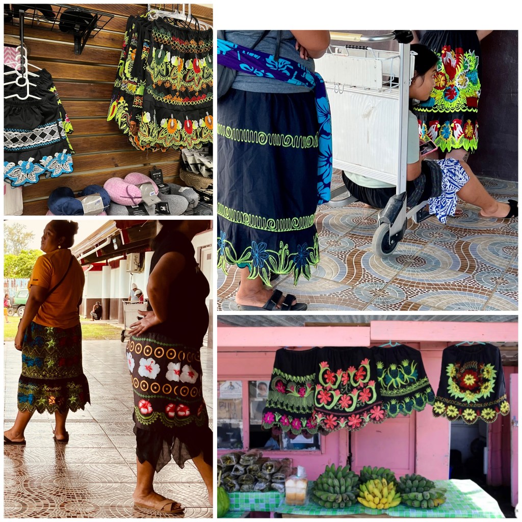 Millest ma siin Mikroneesia kohta rääkinud pole, aga mis vaieldamatult tõmbab mu tähelepanu on naiste seelikud ja kuldhambad. Seelikud tikitud mõnedel ka lihtalt trükitud mustriga, alumine serv laineline või sakiline või säbruline, igatahes mitte sirge. Seeliku pikkus on veidi alla põlve ja seda kasutatakse nii õlapaelteta kleidina- mõnikord ka T-särk all kui ka seelikuna- mõnikord lisaks ka all seelik või kleit seeliku all. Kannavad nii vanad kui noored. No pm nagu kittel, et võid kõikide riiete peale tõmmata, aga võib ka niisama kanda. Ja kulla värvi hambad. Kas kullast või mitte, et tea, aga samamoodi nii vanadel kui noorematel. Tundub uhkuse asi olevat. Aga hambaststi silti küll ei näinud ja ka haigla oli väljaspoolt tagasihoidlik.