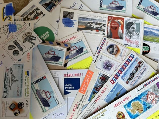 The envelopes containing our postcards did not need a postmarks, except for the one addressed to Terre Adélie. Vanessa weighed the envelope and added the necessary stamps.