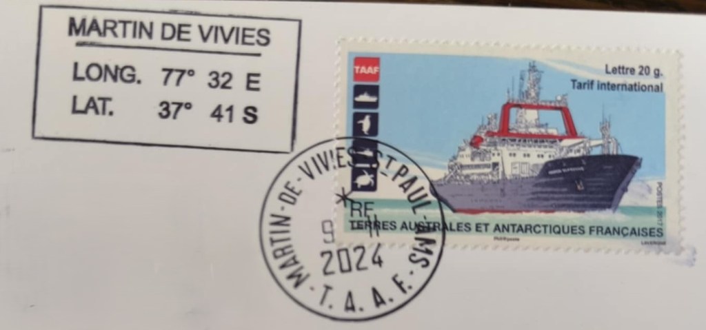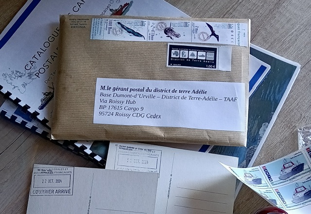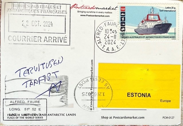 Base Alfred Faure – TAAF. Sent on 22.Okt.2024, Canceled on 24.Nov.2024 in Alfred Faure, Arrived to Estonia 12.May.2025.