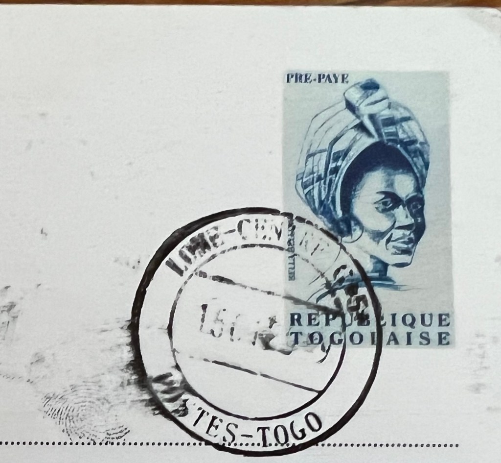 We arrived in Togo (which translates to “Behind the River”) from Benin by bus, traveling with a group of Finns. Our first encounter with Togo’s postal service was at the small Poste D’agbodrafo, conveniently located near our first night’s lodging. Unfortunately, it was Sunday, and closed. However, Monday morning, after a quick breakfast, we managed to send off a few postcards before our group departed for Lomé. I later discovered online that this small post office had won an award in 2023 for its excellent customer service—a delightful surprise!