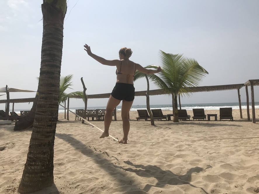 Group travel also offers unexpected perks. After days of exploring, while the post office was closed, I learned a new skill thanks to a fellow traveler’s slackline. Almost every evening, he’d set it up between palm trees, and generously allowed me to practice.