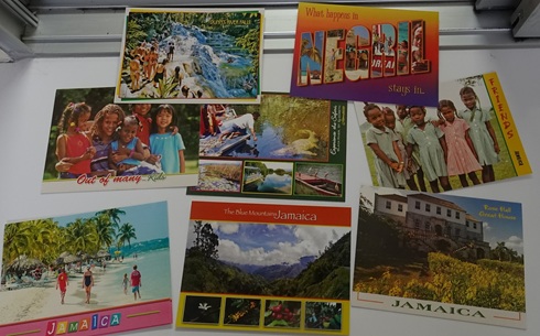 Our Jamaican postcard adventure began on a Sunday, with our arrival in Kingston, the island’s bustling capital. As it was Sunday, all Post Offices was closed as were most of the shops. While wandering the quiet streets, we stopped at a gift store where they dug out a dusty pack of postcards and asked for a dollar each. Since we had rented a car and planned to stay in the country for four days, we hoped to find a better selection elsewhere.
