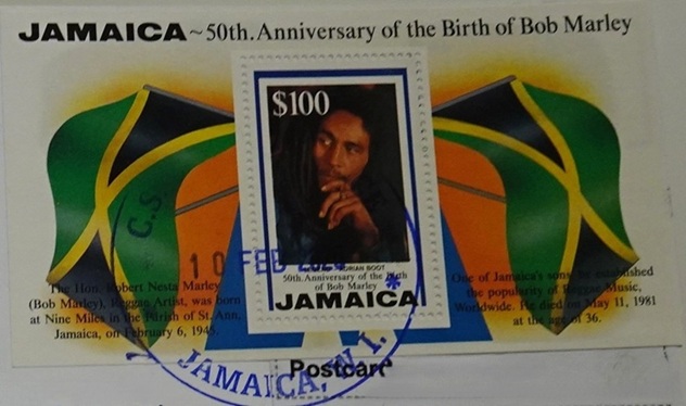 Time for plan B. The employee brought out his stamp albums, and we chose from what was actually in stock. Given that Jamaica’s most famous musician of all time is Bob Marley, we weren’t surprised to find at least three different stamps featuring him.