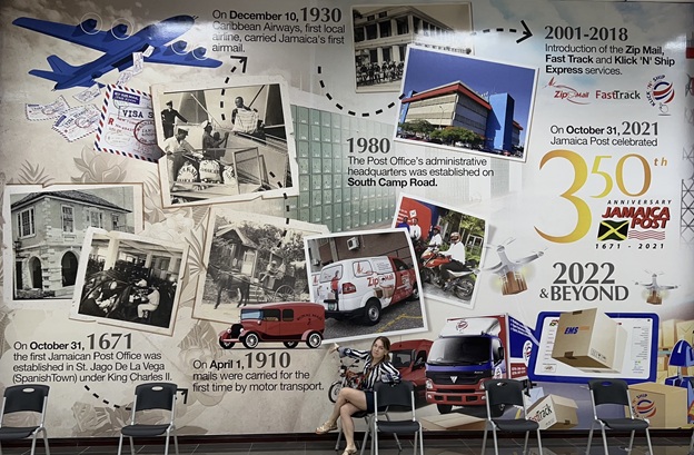 But back to our postal mission. The next morning, we visited the general post office—a large building with the Jamaica Post logo. Inside, a huge mural displayed the country’s postal history in a visual timeline, which I took as the perfect summary of Jamaica’s postal past.