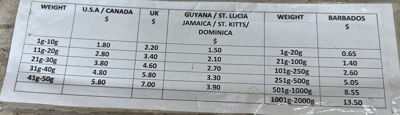 - Cost of sending mail: North America 1,80 BBD (0,9 USD), UK, Europe 2,2 BBD (1,1 USD) Caribbean Islands 1,5 BBD (0,75 USD).