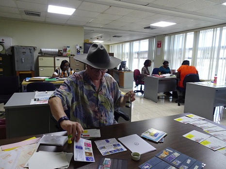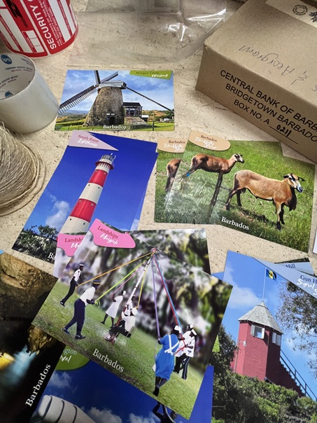 The room was spacious, with work desks alongside displays of stamps and large posters detailing the postal history of Barbados—a perfect place for us! It was Philatelic Bureau, the place we didn’t know that exists. A table was immediately set aside for stamping our postcards, and a date stamp was provided. The stamp selection was so beautiful and extensive that we decided to send a few more postcards than originally planned.