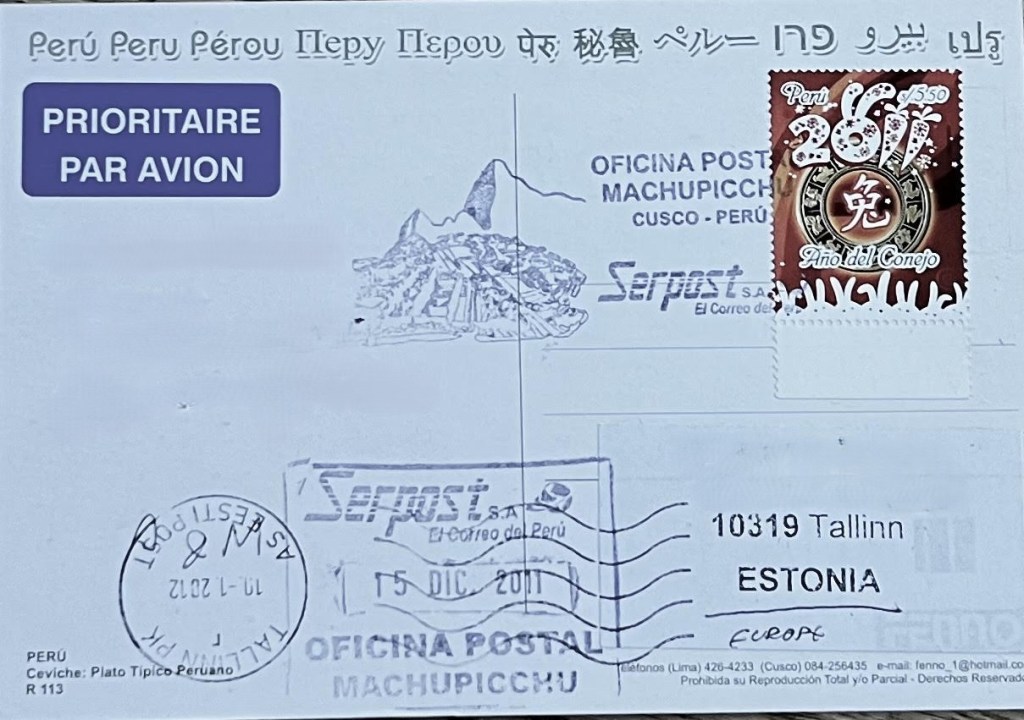- Postcard delivery time: From Aguas Calientes, Peru to Tallinn, Estonia – 25 days