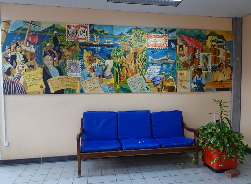 One wall displayed a mural detailing the history of Dominica’s postal service, from the 18th century up to 1993 — the year this building was opened with support from the British. Outside, classic red mailboxes were marked “Surface Mail,” “Inland Mail,” and “Air Mail,” while several taped-up notices strictly prohibited sitting, loitering, and ferry passengers from waiting in the area — all signs of how central and well-placed this post office really is. But we hadn’t planned to linger there anyway.