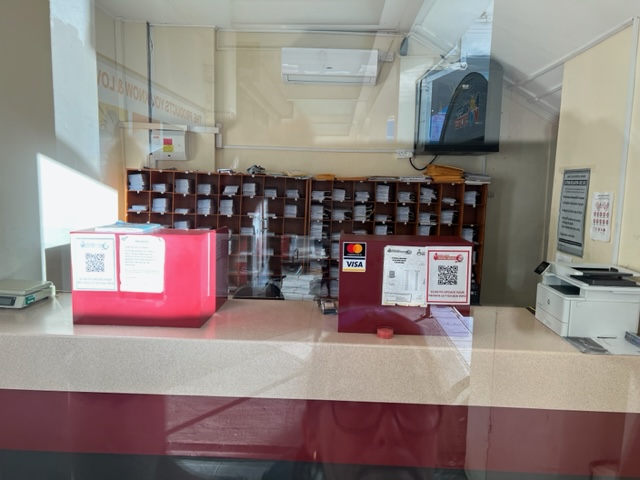 Eventually, we reached Rodney Bay. The post office is located in the same building complex as the JQ Rodney Bay Mall but has its own separate entrance. And yes — it was closed. We peeked through the windows but found no information. We even asked at the grocery store info desk and in a few nearby shops, hoping that perhaps a post office worker might be around. No luck. Determined, we went into almost every shop asking if they sold stamps.
