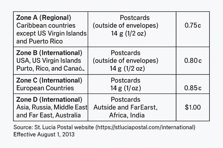 References: St Lucia postal price list, postal_history_of_Saint_Lucia, Saint_Lucia, Castries