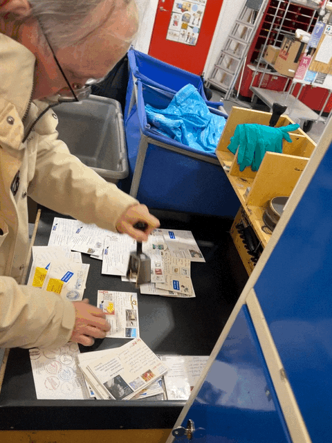 We came prepared—with our postcards already written and addressed. Juliana, the clerk, noticed this right away. She asked just once if we truly wanted to do the stamping ourselves, and when we nodded, she invited us behind the counter. We followed her into the back, where there was a rubber-covered table with stamps and ink pads ready.