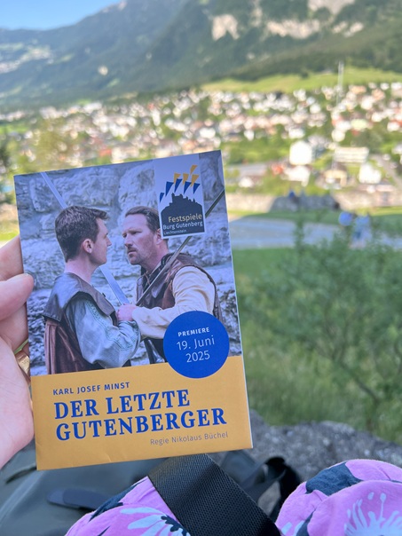 Later in the afternoon, around 4 p.m., we parted ways with our fellow hobbyists, full of postcards and stories. But since the day was still young (despite the 30°C heat), we climbed up to Gutenberg Castle, which towers 70 meters above the town. To our delight, we found that a local theater performance was starting in an hour — and even though the dialect was hard to follow, the show’s energy and physicality made it thoroughly enjoyable.