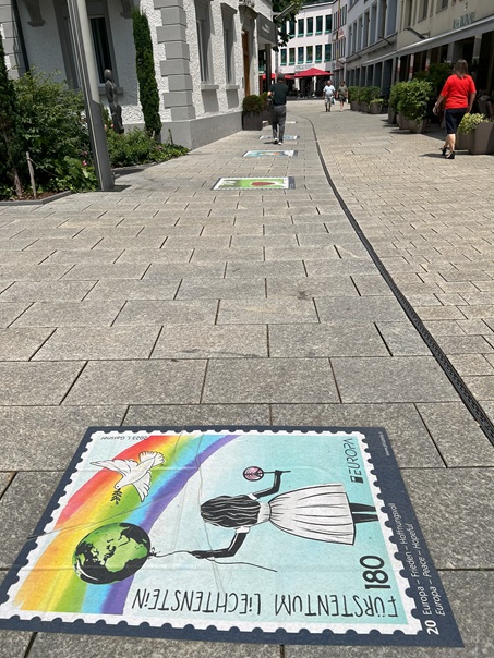 That stamps really matter here is clear even on the pedestrian street in Vaduz, where the sidewalk is decorated with images of historical Liechtenstein stamps.