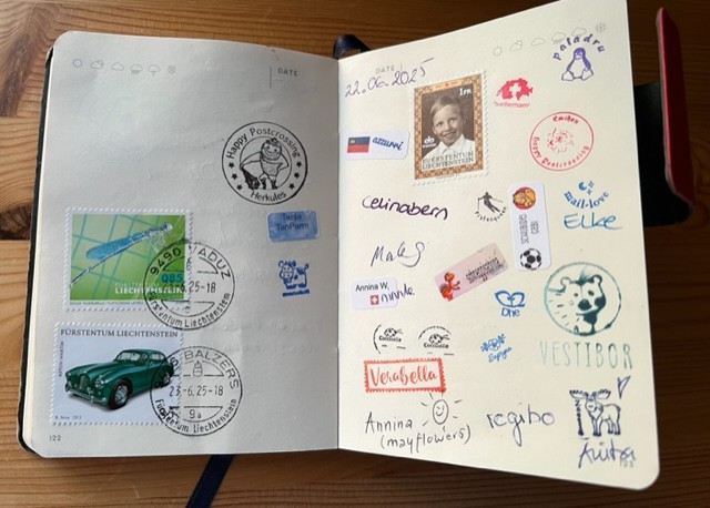 As for our travel journal, we wanted a dated postmark to mark our visit — and yes, both in Balzers and Vaduz, the staff were happy to oblige. We just had to stick a stamp into the notebook first — but not an old one. Even for a souvenir, they wouldn’t stamp anything with an invalid stamp.