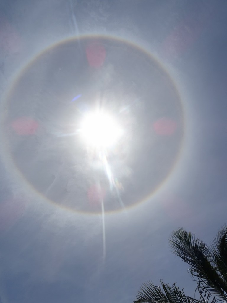 At some point, half-awake, I opened my eyes and looked up. Around 12:50 PM, the midday sun was surrounded by not just one, but two perfect circles of light.