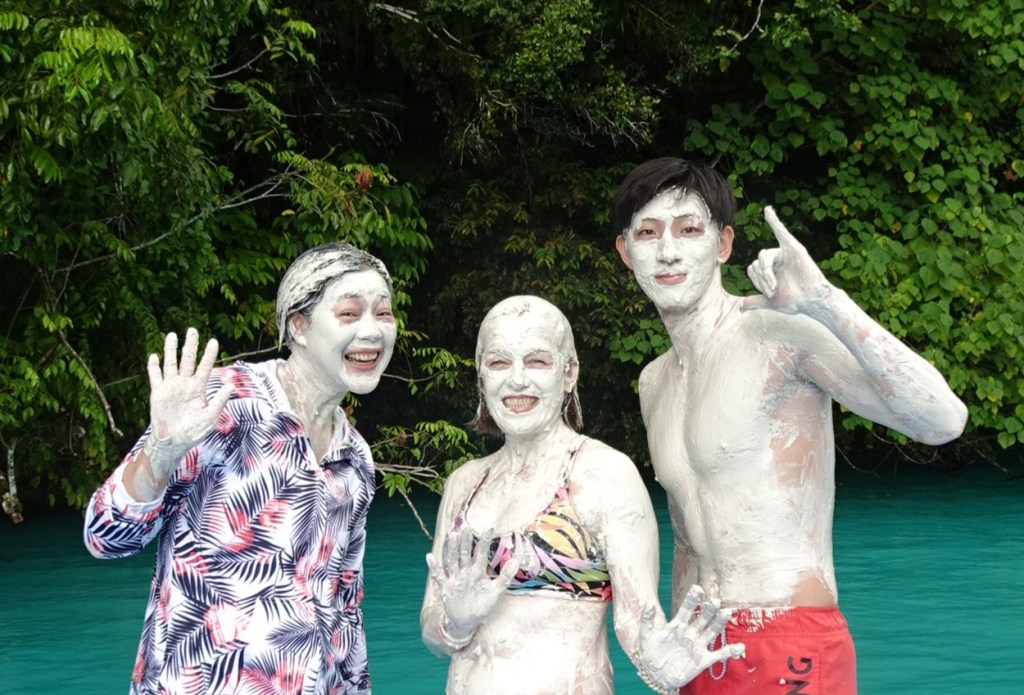 Of course, my trip wasn’t only about the post office. Palau’s nature is breathtaking, and the next day I joined a snorkeling tour in the Rock Islands Southern Lagoon. It rained that day, but it turned out to be a blessing: fewer boats, no risk of sunburn, and a peaceful ride. Our first stop was the famous Milky Way Lagoon, a dreamy stretch of turquoise water framed by lush green islands, where we covered ourselves with the local white clay, which is said to be good for the skin.