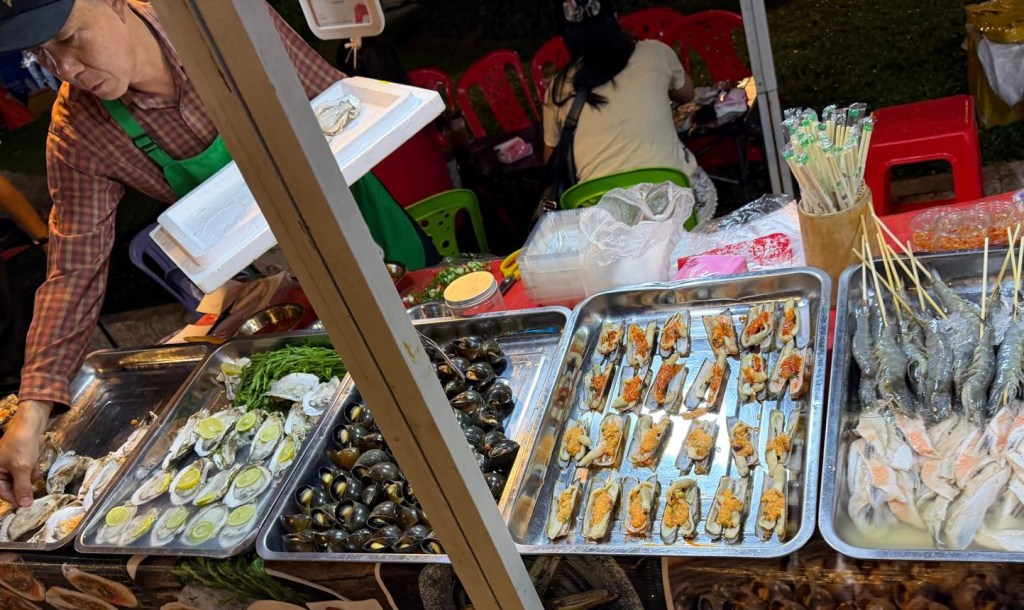 Impressive as the General Post Office was, the evening’s biggest surprise came from right across the street. By nightfall, the riverside promenade opposite the post office had turned into a long line of tables set up side by side, each offering something more exotic than the last. Stretching for more than two kilometers, it was packed with people, food, and curiosity.